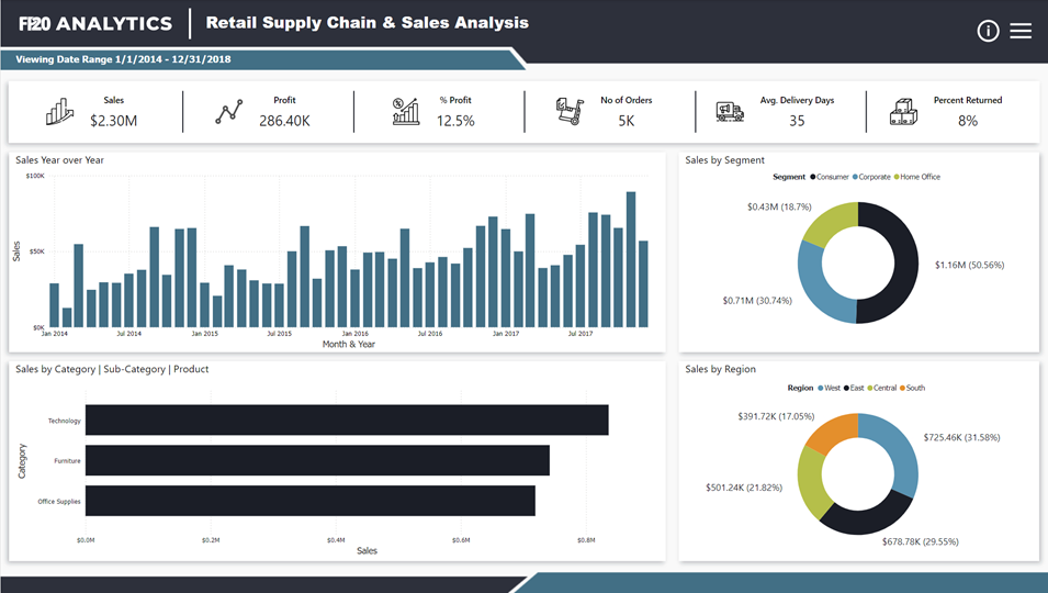 This KPI report gives you a clear view of performance: start by monitoring high-level trends, then analyze deeper patterns, and explore details as needed.