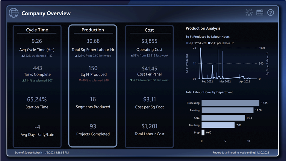 The production performance report delivers key insights into production efficiency, cycle times, and cost management. Designed to support operational decision-making, this report highlights areas for process improvement, tracks cost trends, and provides a comprehensive view of production metrics.
